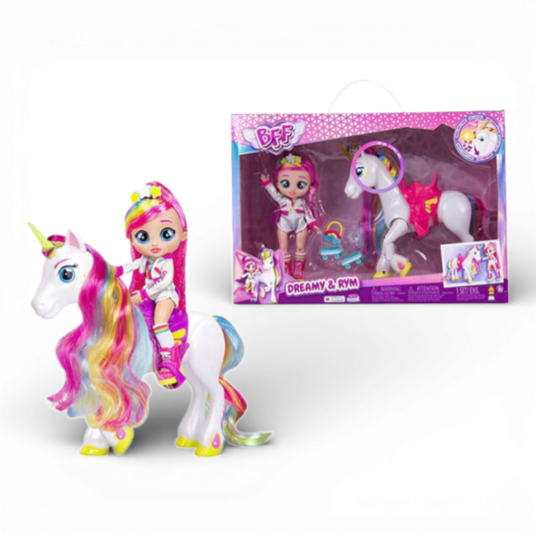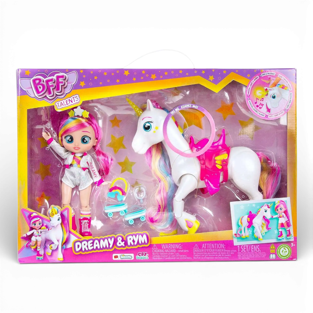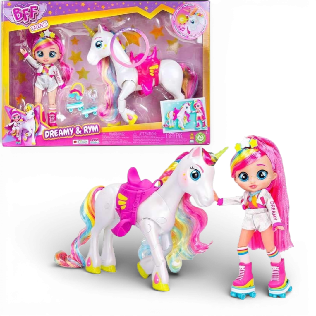 Le Bff Talents Dreamy e Rym sono bambole pensate per raccontare storie di amicizia, talento e creatività. Con le Bff Talents Dreamy e Rym, i bambini possono inventare avventure ispirate al mondo della musica e dello spettacolo.