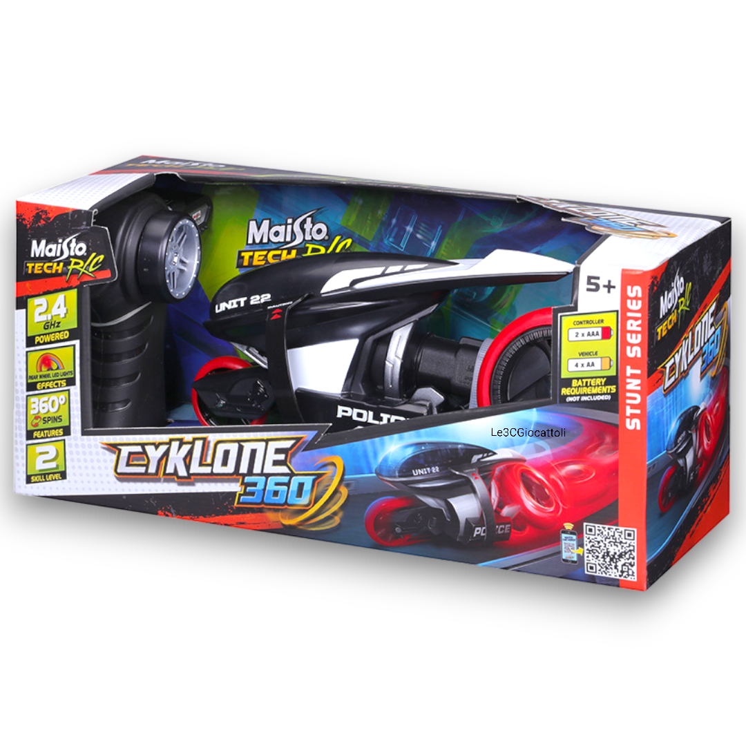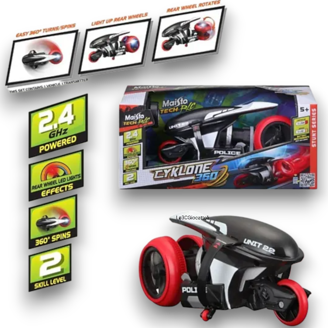 Il Cyklone 360 Motoevoluzioni permette rotazioni a 360° e acrobazie mozzafiato, offrendo un’esperienza di guida unica. Costruito con materiali di alta qualità, il Cyklone 360 Motoevoluzioni è resistente e adatto a ogni terreno.