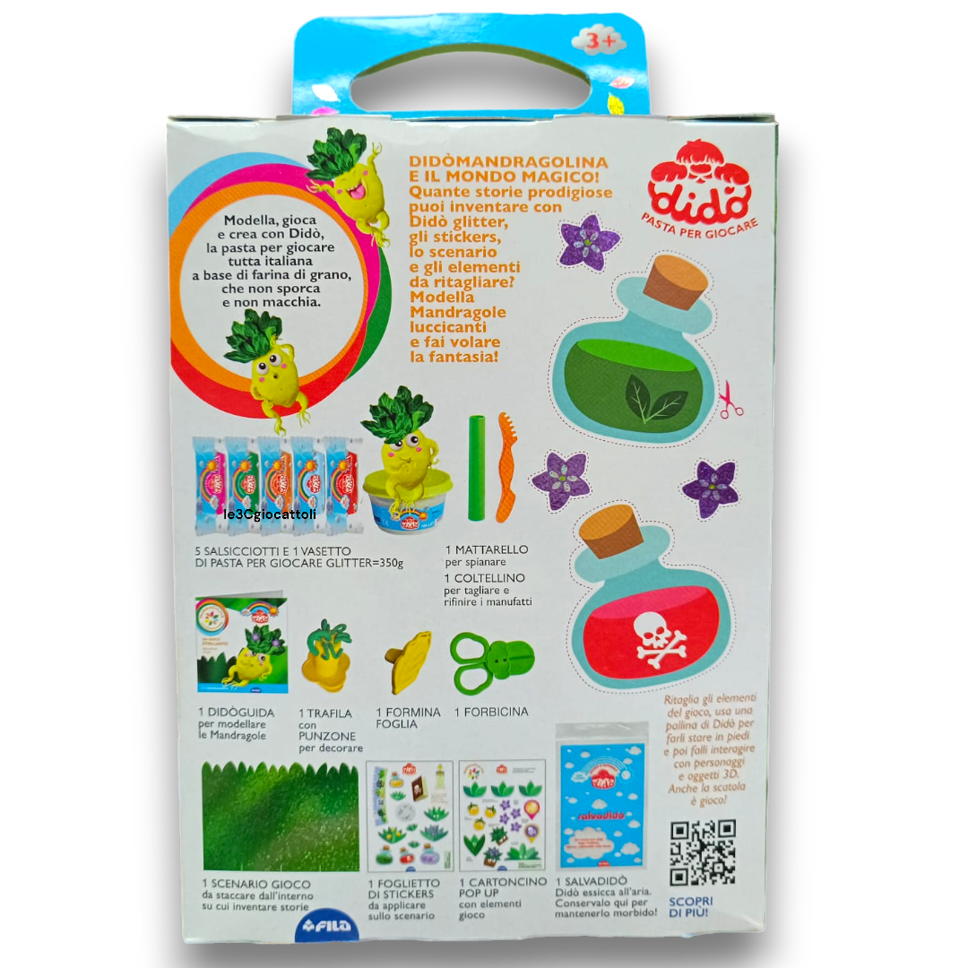 Con Dido Giocacrea Fantamici Mandragolina Plastilina i piccoli artisti possono dare vita alla magica Mandragolina e ai suoi amici, utilizzando plastilina Didò colorata ed in versione Glitter di alta qualità, facile da modellare e perfettamente sicura.