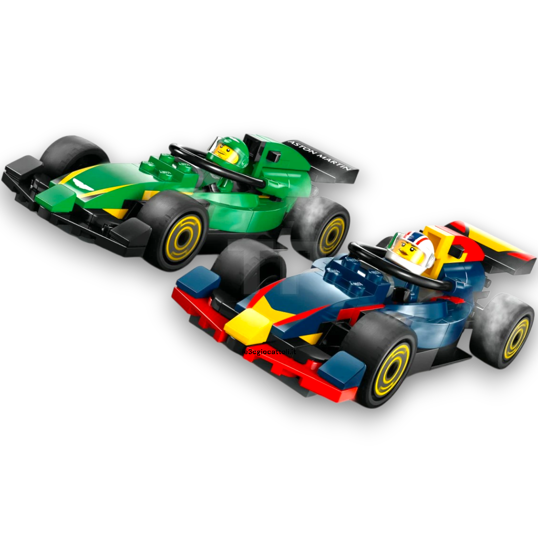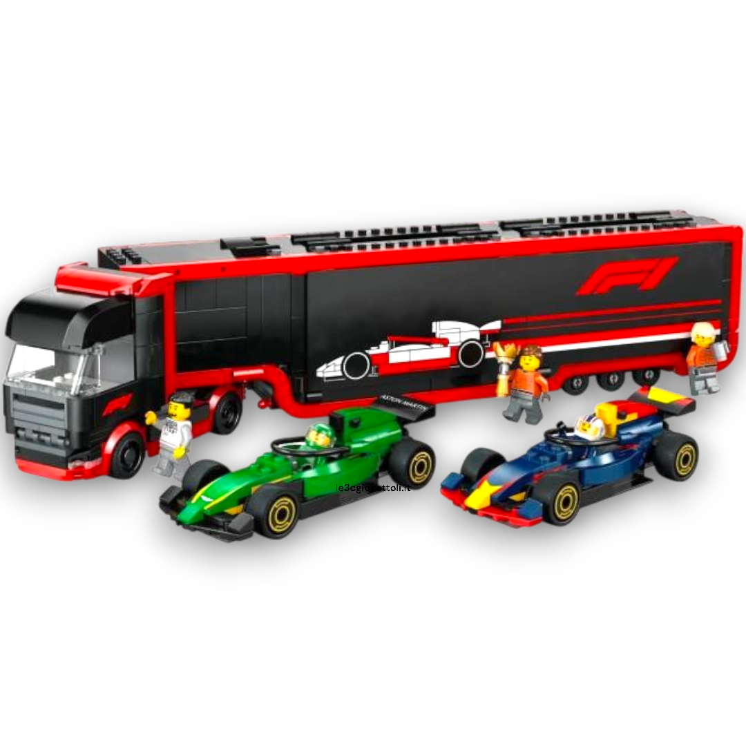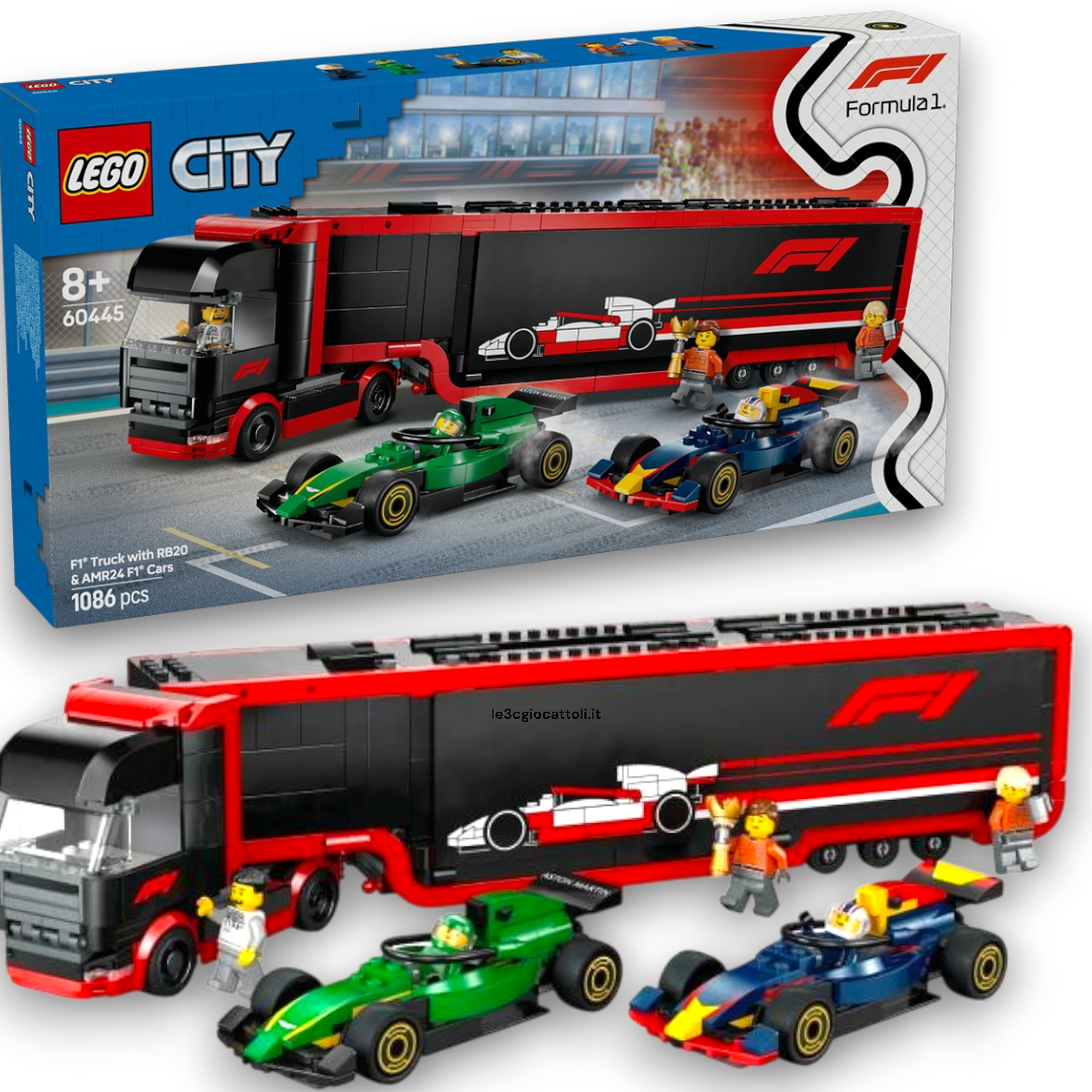 Il dettagliato camion trasporta due auto da corsa iconiche, rendendo il Lego City 60445 Camion F1 con Vetture Aston Martin e Red Bull una scelta imperdibile per gli amanti della Formula 1.