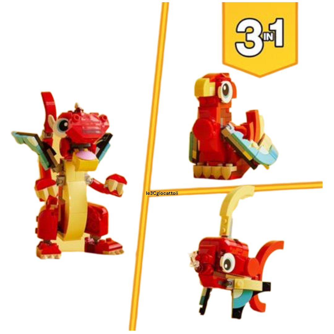 Ogni costruzione del Lego Creator 31145 Drago Rosso 3in1 è progettata per essere robusta e facile da assemblare, con istruzioni chiare che guidano i bambini attraverso il processo di costruzione. Il Drago è dotato di ali e coda articolate, mentre il Pappagallo e il Pesce presentano dettagli accurati che rendono ogni modello unico e divertente da giocare. Questo set Lego Creator 31145 Drago Rosso 3in1 è perfetto per i bambini che amano le creature fantastiche e che vogliono dar vita a nuove avventure ogni volta che costruiscono.