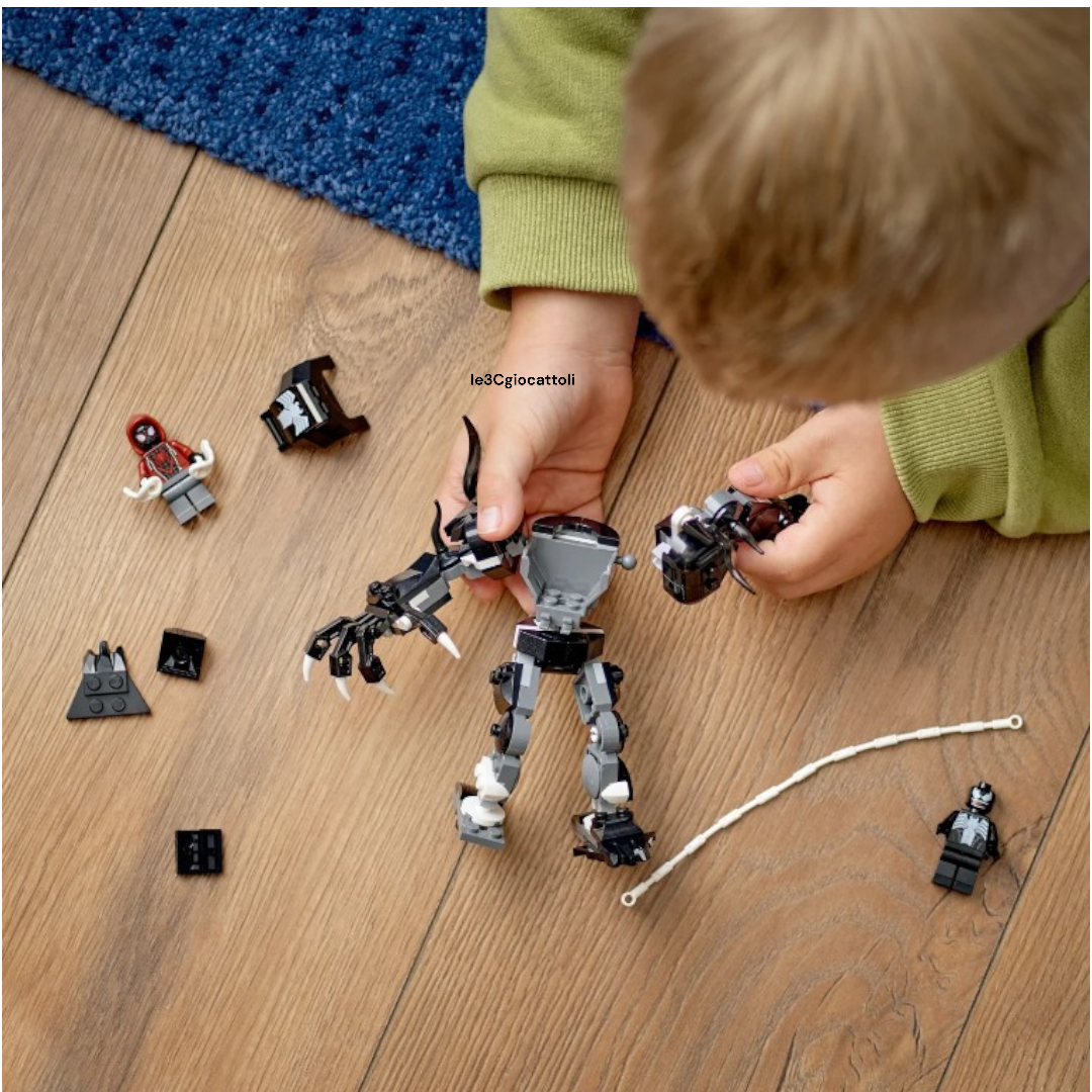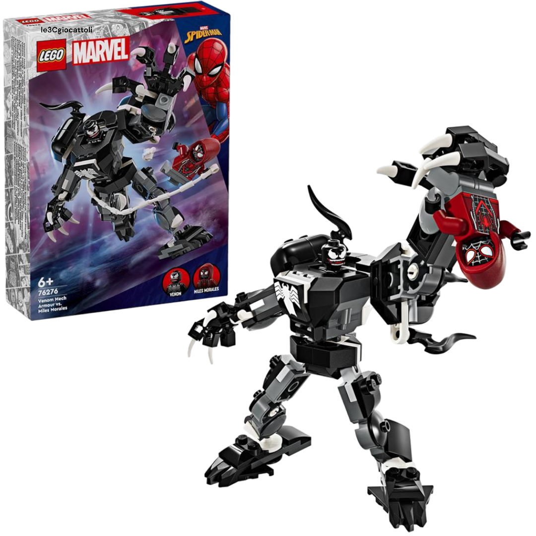Il set Lego Marvel 76276 Venom Mech Armour vs Miles Morales ti permette di costruire la Mech Armour di Venom, una macchina da guerra imponente, con articolazioni mobili, una bocca che si apre per rivelare denti affilati e una lunga lingua, oltre a mani artigliate capaci di afferrare la minifigure dell'avversario. La sua estetica nera e bianca riflette perfettamente l'aspetto sinistro del personaggio nei fumetti e nei film.