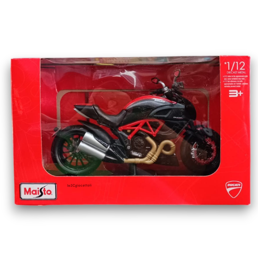 La Moto Ducati Maisto 1:12 è un modello in metallo, adatto dai 3 anni in su, e offre finiture di alta qualità con dettagli minuziosi. Questa Moto Ducati Maisto 1:12 si presenta su una basetta che ne esalta l'eleganza, rendendola ideale per collezionisti.