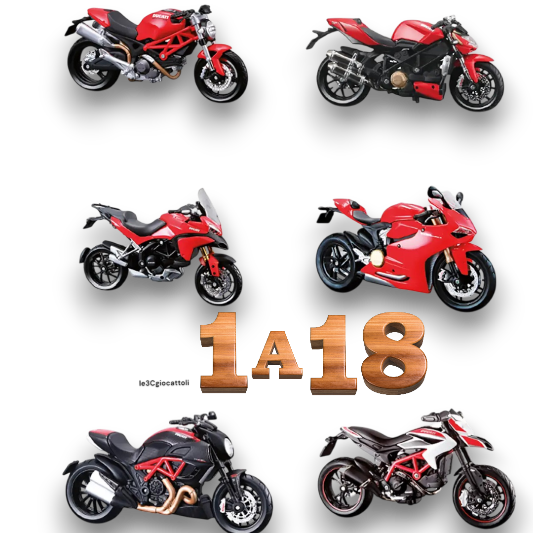 La Moto Ducati Maisto 1:18 è un modello in metallo minuziosamente rifinito e dettagliato, perfetto per collezionisti e appassionati. Ogni Moto Ducati Maisto 1:18 è posizionata su una basetta che ne esalta la bellezza e i dettagli.