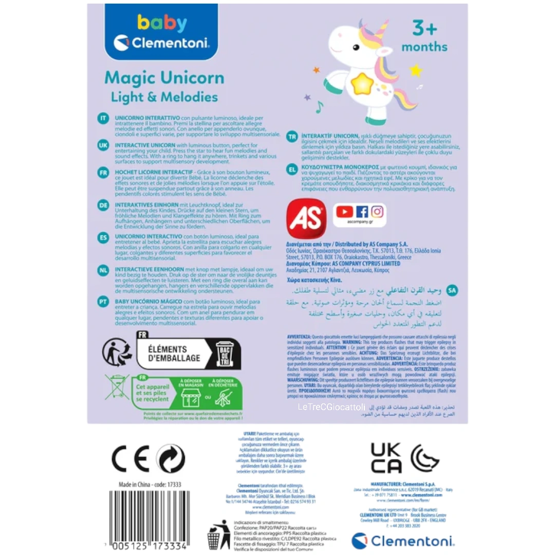 Realizzato con materiali sicuri e di alta qualità, il Sonaglino Magico Unicorno Interattivo Clementoni è perfetto per accompagnare la crescita dei più piccoli, rendendo il gioco un’esperienza divertente e formativa.