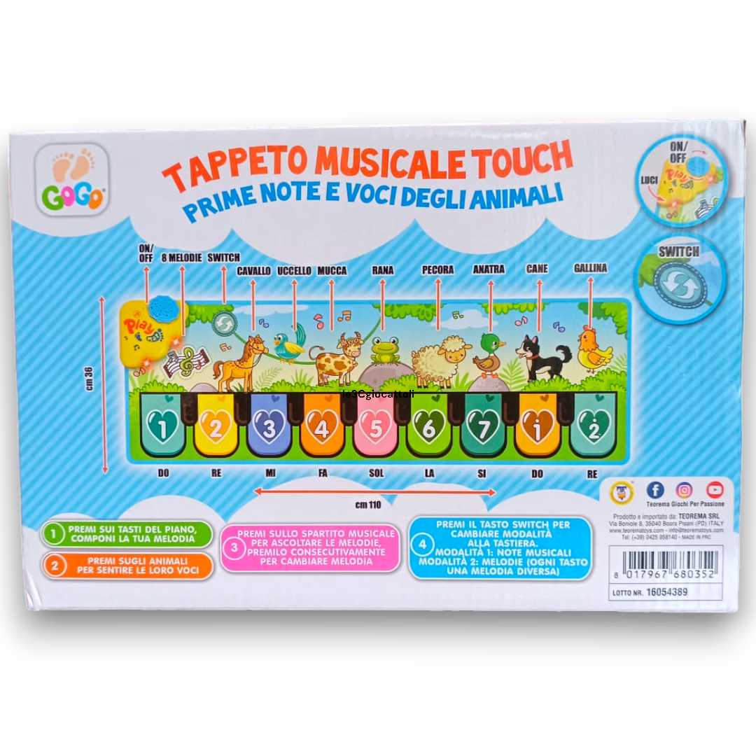 Realizzato con materiali di alta qualità, il Tappeto Musicale Touch è resistente e sicuro per l'uso quotidiano. Ogni tocco sul tappeto attiva suoni diversi, tra cui i versi di vari animali e note musicali, aiutando i bambini a riconoscere suoni e sviluppare le loro capacità motorie e cognitive. Le luci integrate aggiungono un ulteriore livello di interattività, incoraggiando i bambini a esplorare e giocare.