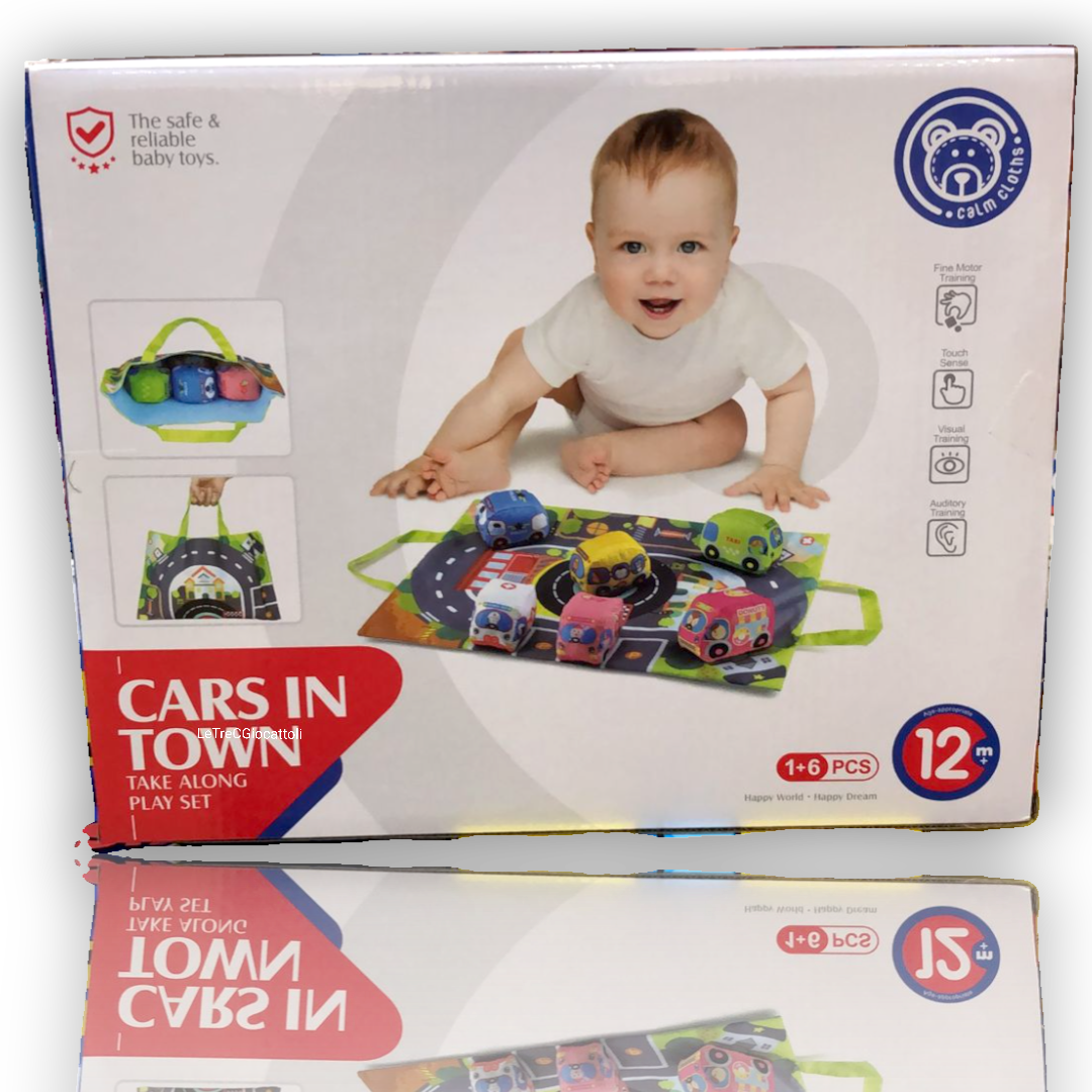 Questo Tappeto Pista con 6 Auto richiudibile a borsa include 6 auto in stoffa e una pista colorata, per stimolare le capacità sensoriali e la creatività dei bambini.